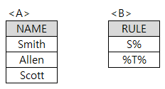 WHERE A.NAME LIKE B.RULE --> <A>테이블의 NAME 필드 값이 B테이블의 RULE 필드의 조건과 일치하는